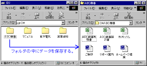 ワープロや表計算などで作成したデータは、あらかじめフォルダを作成しておき、その中に保存しましょう。するとバックアップを取る時、ファイル単位ではなくフォルダごとコピーすることができるので便利です。