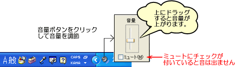 「ミュート」のチェックボックスがオンになっていると音が消えますのでご注意ください。