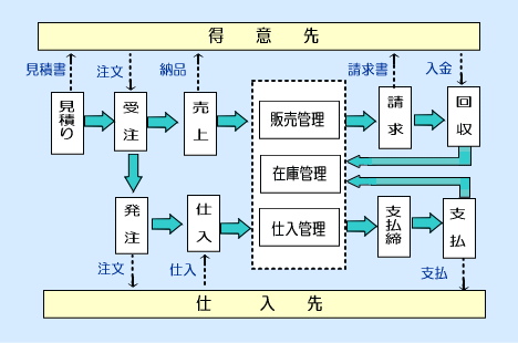 販売管理が売上・請求など得意先との取引を管理するのに対し、仕入・在庫管理は、仕入・支払など仕入先との取引を管理するものです。