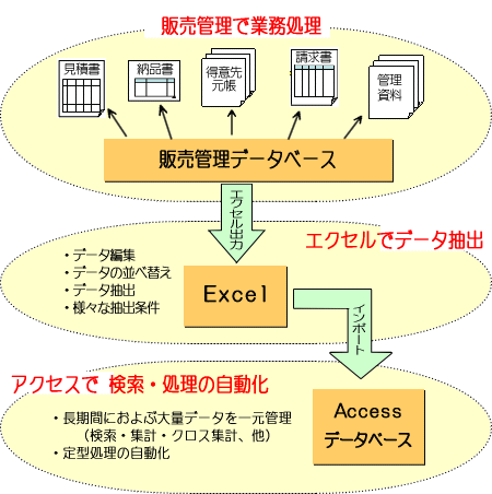 販売管理とエクセル、アクセスなど複数のソフトをうまく連携活用することで、システム化できる部分が広がり業務改善につながります。