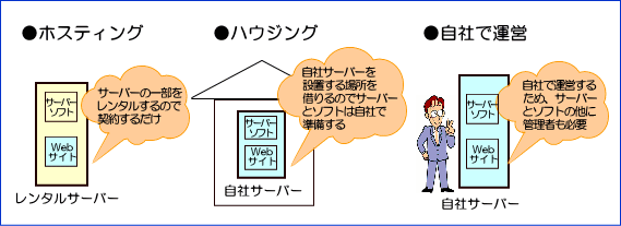 したがって、自社にシステム部門がない場合には、ホスティング・サービス(レンタル・サーバー)を利用する方法が適しています。