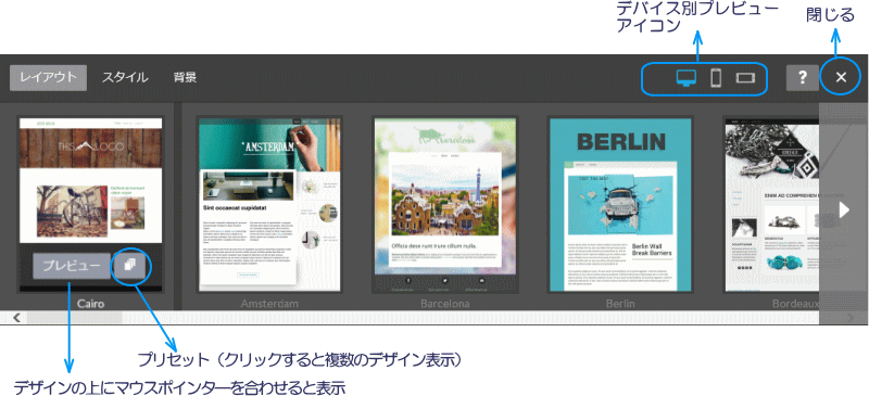 また、1つのレイアウトにデザインの異なる複数の「プリセット」(バリエーション)が準備されています。例えば、「Tokyo」レイアウトでは、ヘッダーの背景は1種類(トップページ1か所)しか表示できませんが、「Tokyo」のプリセットの「Aoyama」など、レイアウトによっては、ページ毎に別の背景を表示できるものがあります。プリセットを上手く活用しましょう。