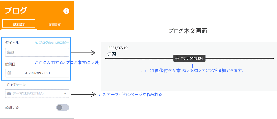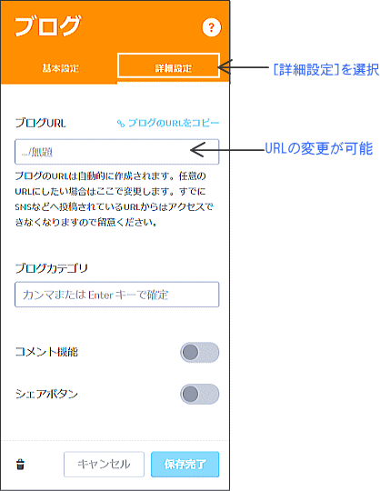 また、ブログ記事のURLは日付やタイトルで自動生成されます。[詳細設定]で記事のURLを変更することができます。投稿後、ブログ記事の編集で、ブログURLを変更しましょう。