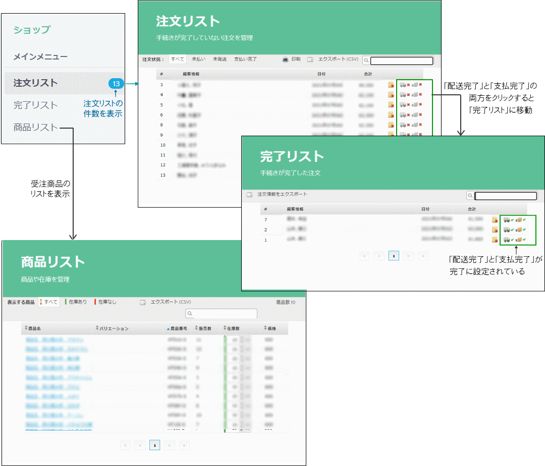 Jimdoのショップ機能には、受注と商品の管理ができます。 注文が入ると「受注リスト」に表示され、「発送完了」と「支払完了」になれば、「完了リスト」に移動します。メニューの「受注リスト」項目には、現在の受注リスト件数が表示されているので、現状把握に役立ちます。