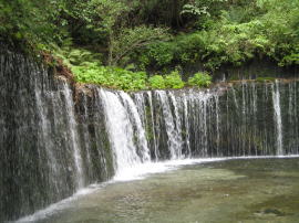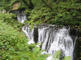 緑の樹木がたくわえた 浅間山の地下水が 白糸の滝となってこの景観をつくり