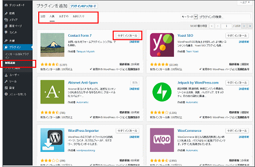 ●「Contact Form7」は、問合せフォーム作成の定番プラグインです。問合せページを作成する場合は「新規追加」からインストールして利用してください。