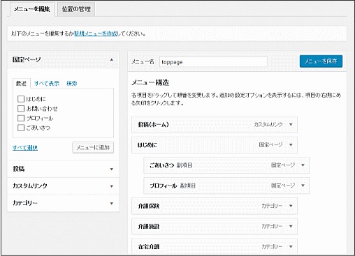 しかしながらブログの場合、古い記事は下に埋もれてしまいます。そこで、カテゴリー毎に記事を見ることができるよう、カテゴリーをメニューにすることにしました。